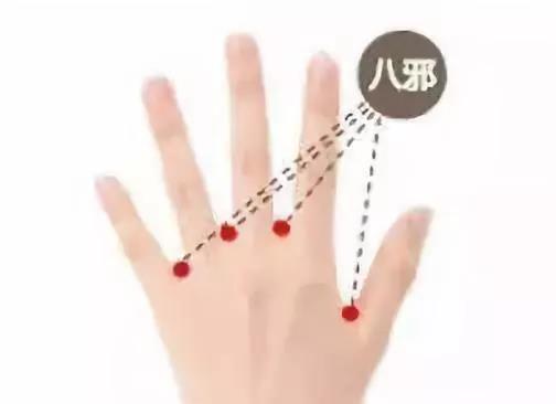 八邪(在十指第一至第五指缝端,指蹼缘后方赤白肉际处,两手共8穴)。两手十指张开,手心向内,两手同时用力互击手掌,一撞击一拨开,连续不断反复击2~3分钟。