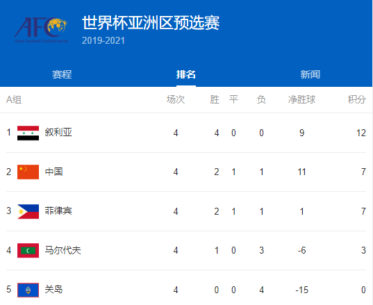 此役过后,叙利亚4战全胜积12分排名小组第一,中国队2胜1平1负积7分,暂时排名小组第二。
