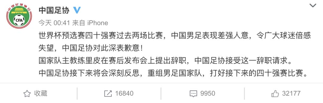 今天凌晨,@中国足协发布微博,表示接受里皮辞职请求。