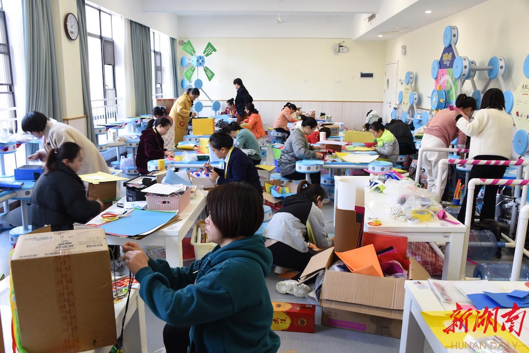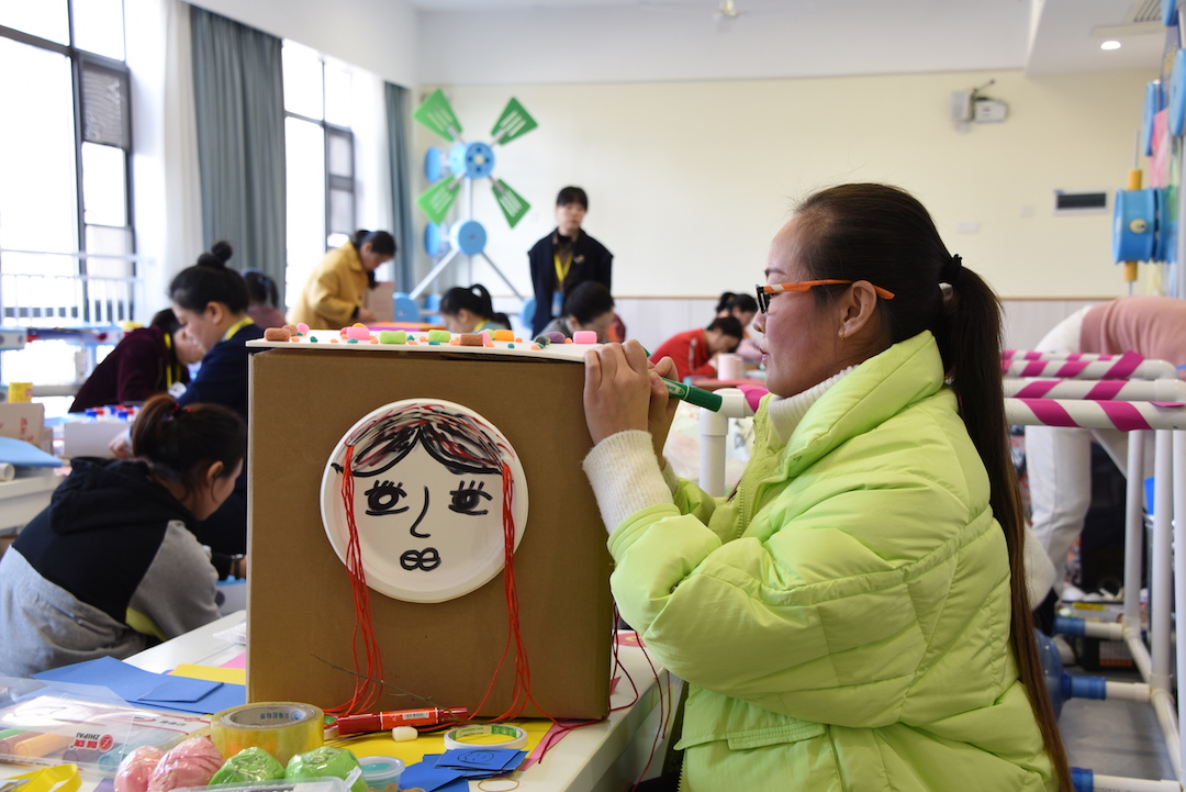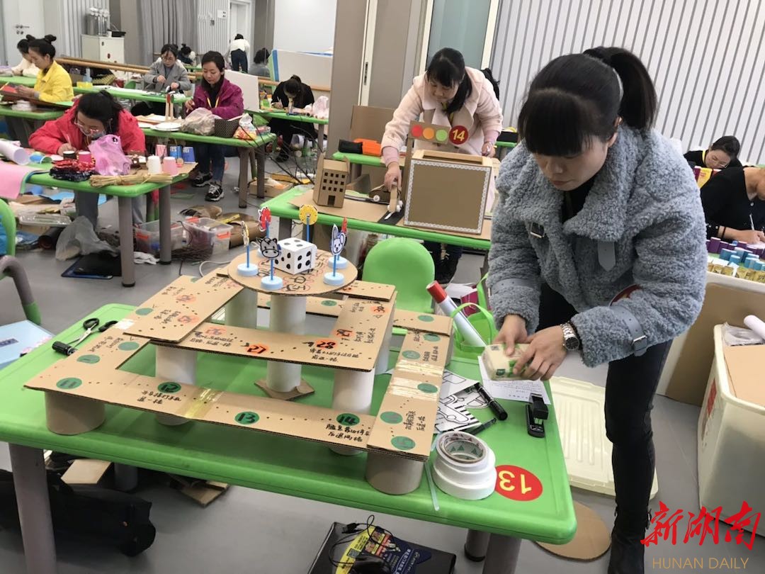 保育员组进行自制玩教具。保育员在幼儿园里负责照管儿童生活,扮演者照顾者、教育者等多种角色,对幼儿的身心健康、行为习惯以及个性、情感等各方面均产生着深刻的影响。