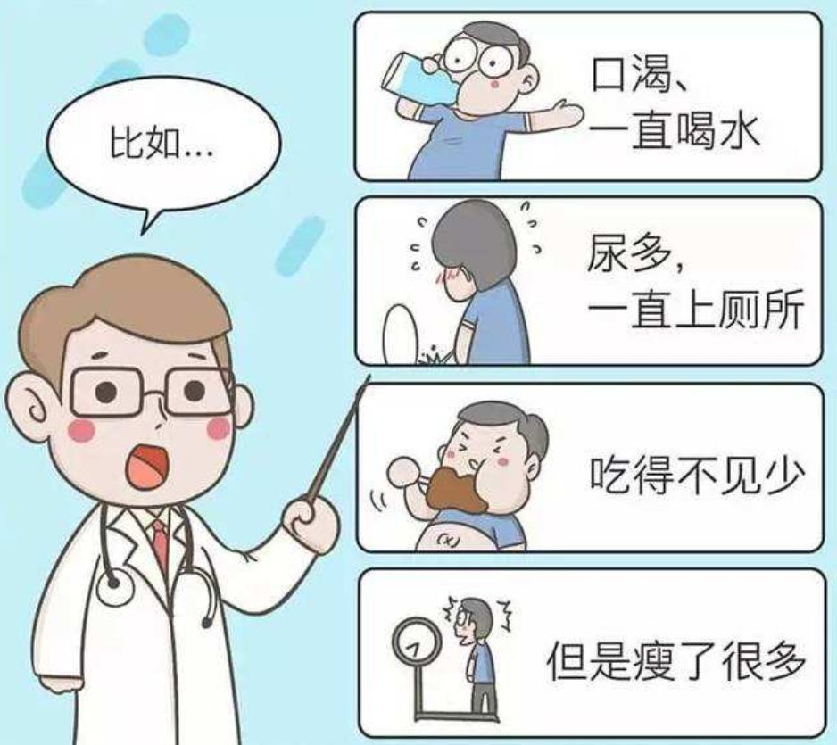 糖尿病是一种以高血糖为特征的慢性进展性疾病,除1型糖尿病起病较急外,2型糖尿病早期轻度高血糖时常无临床自觉症状。血糖明显升高者可出现“三多一少”的典型症状,即多尿、多饮、多食、体重下降。