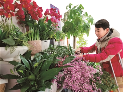 顺着保安手指的方向,记者在巷子里找到了颜轲和他的花店。这天正值农历小年,颜轲没有闲着。给植物换盆、剪枝、浇水,每道工序他都一丝不苟。“马上要过年了,红掌、发财树这类植物比较受欢迎,打理精致才对得起顾客。”颜轲轻轻拍掉身上的泥灰,脸上扬起清澈温暖的微笑。若不是腋下那对拐杖,很难让人将他与肢残人士联系起来。