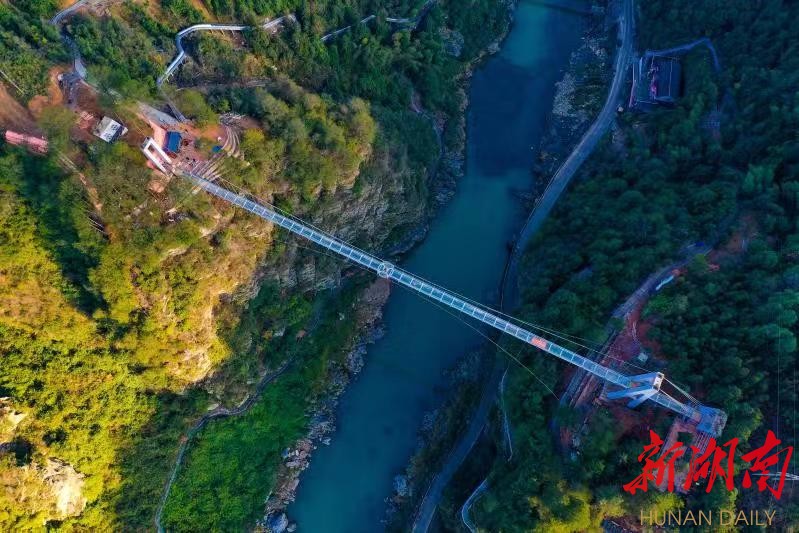 玻璃桥跨河而造,跨弧360余米,凌空千丈。漫步此桥,超薄透明的一层玻璃下面,两岸则是刀削斧劈的悬崖峭壁,峡谷犹如万丈深渊。玻璃桥透光率高,游客站在几乎隐形的玻璃桥上,居高临下,仿佛整个人腾云驾雾在蓝天白云之中;下观两岸鬼斧神工的峭壁,脚下溪河水流湍急,惊涛骇浪!这险峰险谷的山水风光,恐怕天下难寻。还可以领略红军走过的茶马古道和屈原描写的山鬼原雕、刘洪彪等当代书法大家留在悬崖峭壁上的墨宝。