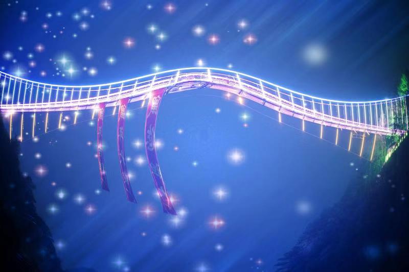 据介绍,这座5D玻璃桥位于溆浦统溪河穿岩山景区,跨越山鬼处的诗溪江大峡谷。“整个桥体飞越360余米,桥的净空高度达128米,雄伟、高大、神奇!玻璃桥建成后,不仅是溆浦首座跨越式玻璃桥,在“锦绣潇湘.神韵雪峰”旅游中也堪称第一桥。”项目负责人左总告诉记者。