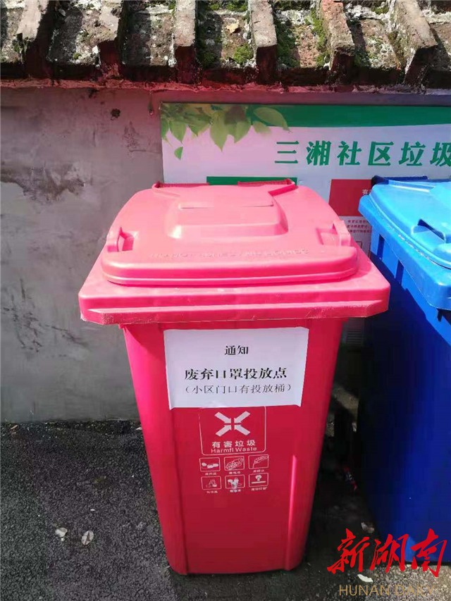 “社区告知我们了,废弃口罩要统一回收处理。”在该街道三湘社区韶山南路入口,这里已新安置了一个红色带盖的垃圾桶,上面贴着醒目的说明“废弃口罩投放点”,一位居民正在按照提示扔掉废弃口罩。