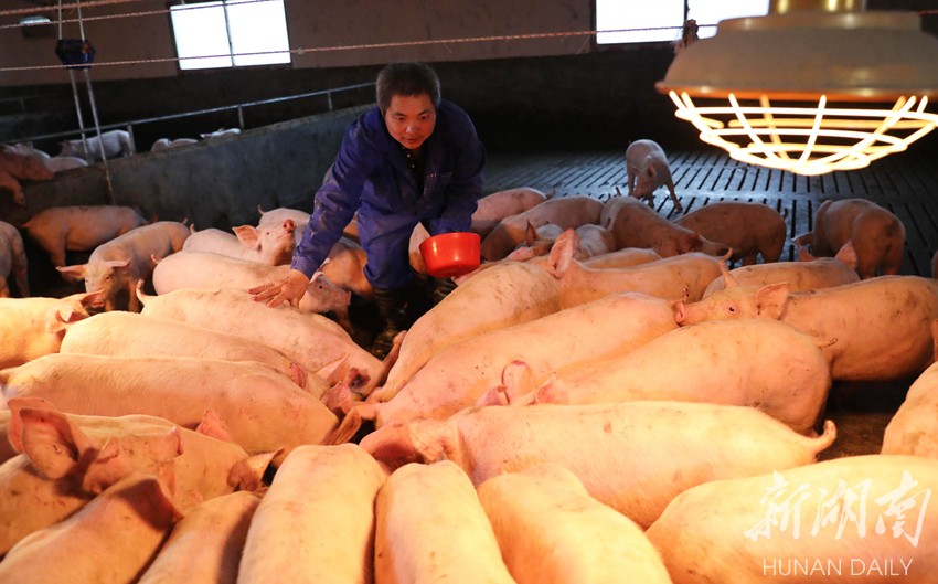 2019年12月23日,道县梅花镇修义村猪场,饲养员在给猪喂食。永州市道县梅花镇修义村为省级贫困村,该村与温氏集团合作建立生猪养殖场,年出栏生猪1900头,每年可为村集体增收19万元,带动8户贫困户增收。此外,该村因地制宜发展脐橙、葡萄、香芋等特色产业,带动群众脱贫致富。何红福 徐靖海 摄影报道