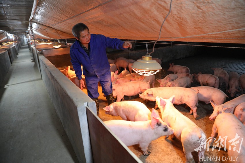 道县梅花镇修义村猪场,饲养员调试猪舍内暖灯。