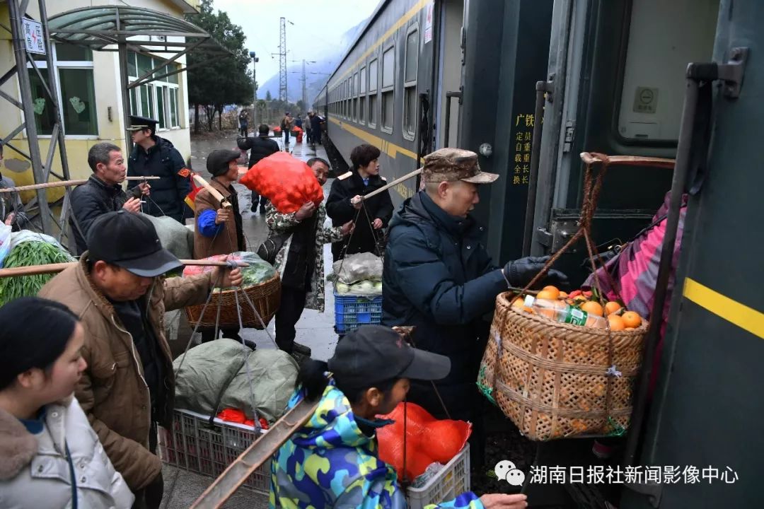 1月11日上午,停靠在湖南省麻阳郭公坪站的7272次列车,当地果农菜农挑着担子准备上车。这趟“慢火车”所经过的地区多为“老少边穷”,经济欠发达。为盘活沿途百姓致富渠道,铁路部门开“绿灯”允许乘客携带大量鲜活货物乘车。