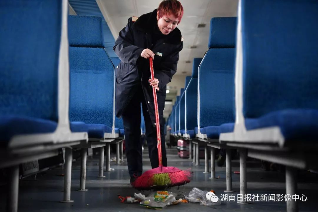 1月11日下午,7271次列车员袁芷琼在打扫车厢卫生。今年50岁的列车员袁芷琼参加工作32年,将于今年11月份退休,这是她最后一个春运。她说看到铁路沿线的百姓生活越来越好,很开心做出了自己的一点贡献。