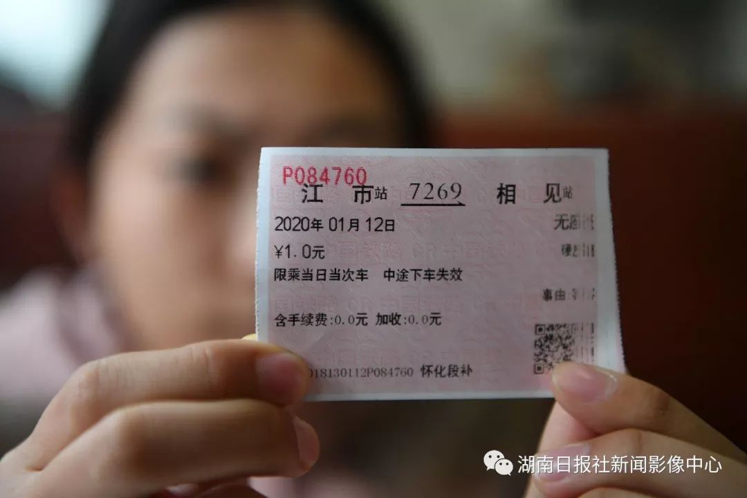 1月12日上午,江市站开往相见站的7269次列车上,一名旅客展示自己的车票,票价只有1元。列车最高票价11元。