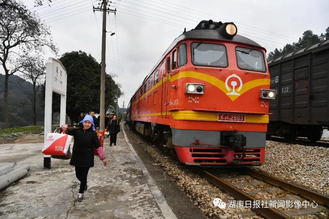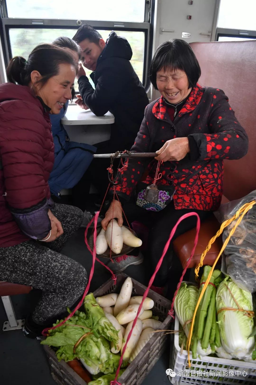 1月11日下午,7271次列车停靠湖南麻阳县漾头小站,湖南卖菜农民乘坐列车开心返回家中。