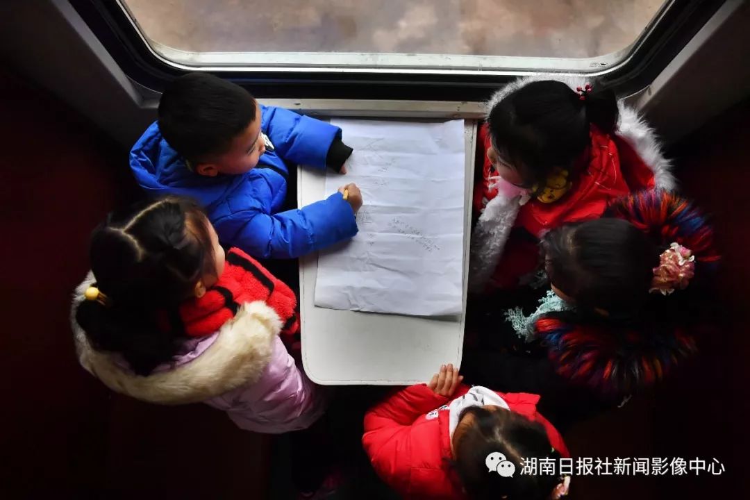 1月12日下午,7269次列车上,几位小学生在车厢里做作业。绿皮“慢火车”穿行在武陵山深处,为沿线百姓提供出行服务的同时,也承担着学生上下学“校车”的责任。