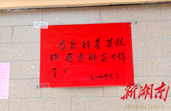 湖南日报·新湖南客户端1月31日讯(张丽珠 刘祝平)“戴口罩总比戴呼吸机好,躺家里总比躺ICU强”“老实在家防感染,丈人来了也得撵”“今天到处串门,明天肺炎上门”“在家待着莫乱跑,感染肺炎不得了”……1月31日,笔者在洪江市黔城镇各村、社区看到,一幅幅充满了“土味”的标语横幅在醒目位置张贴悬挂,让人印象深刻。