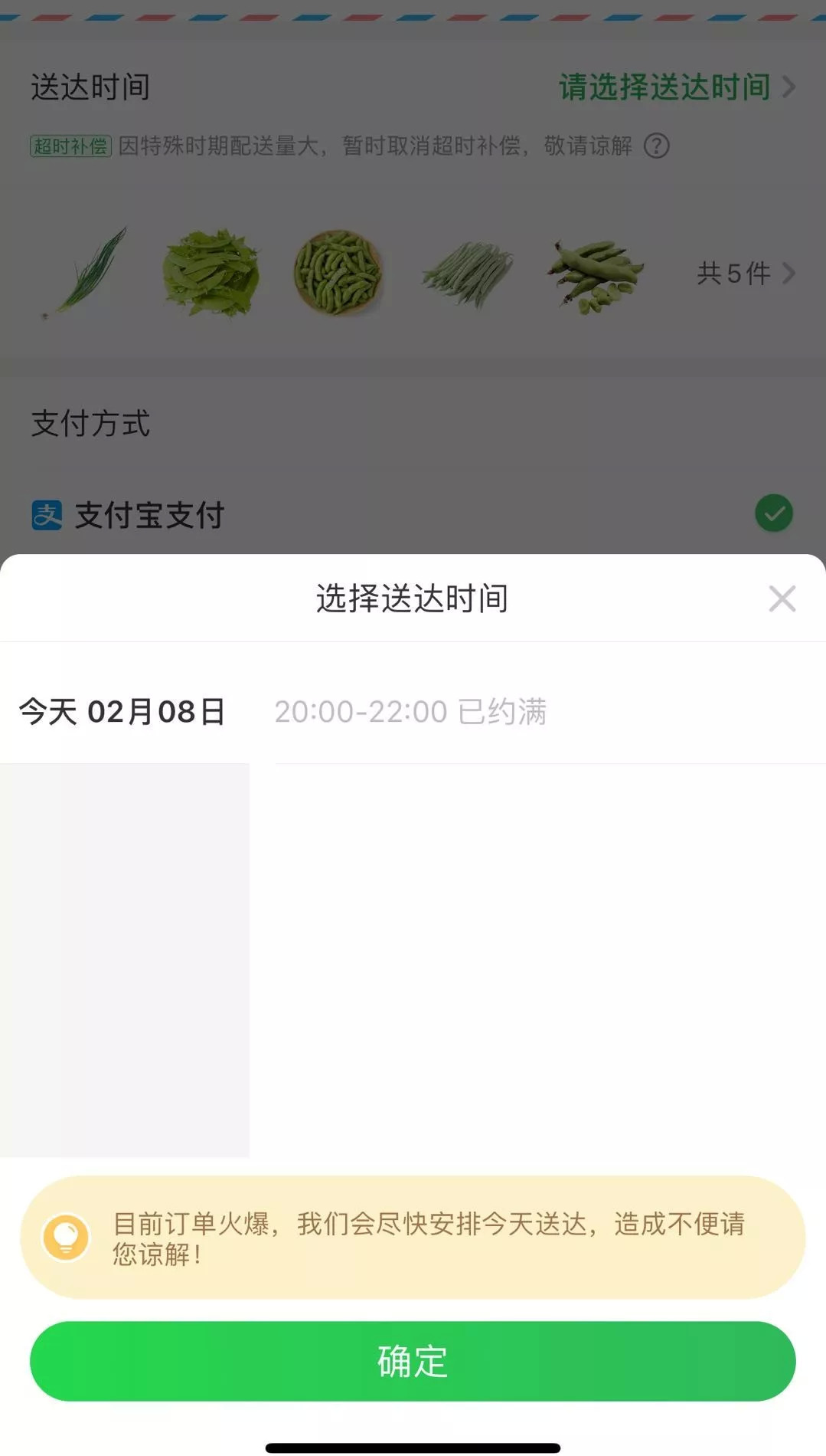 由于配送员已约满,下单时无法选择配送时间,想要当天做饭,是不可能了。
