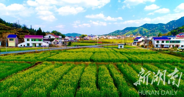 春雨下,溆浦县卢峰镇新坪千亩油菜示范片油菜花开始绽放,与村庄院落、乡村公路构成一幅美丽的乡村春光画卷。微渺 摄