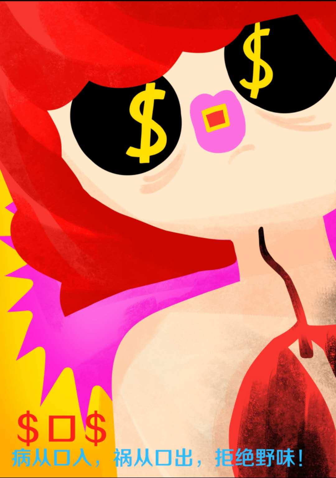 作品说明:拒食野味,不仅仅对自己负责,更是对整个人类社会的根本职责。运用这次“新冠肺炎”病毒的新型代号2019-nCoV封住人嘴,警示病从口入,告诫我们管住嘴,不让自己的贪食与欲望沾染于身体疾病。做到基本的杜绝并远离新冠状病毒。2020我们必定战疫全胜。
