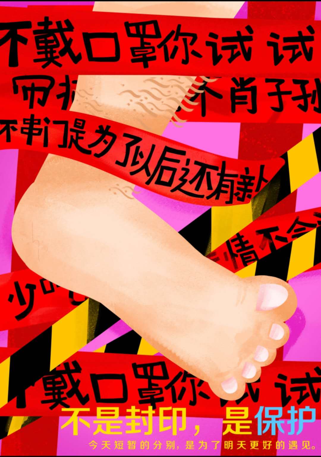 作品说明:插画一直是视觉传达中有着独特魅力的表达方式,该系列作品运用活泼的颜色,可爱的形象打动观众。呼吁大家疫情期间宅在家、做好防护工作以及不吃野味。