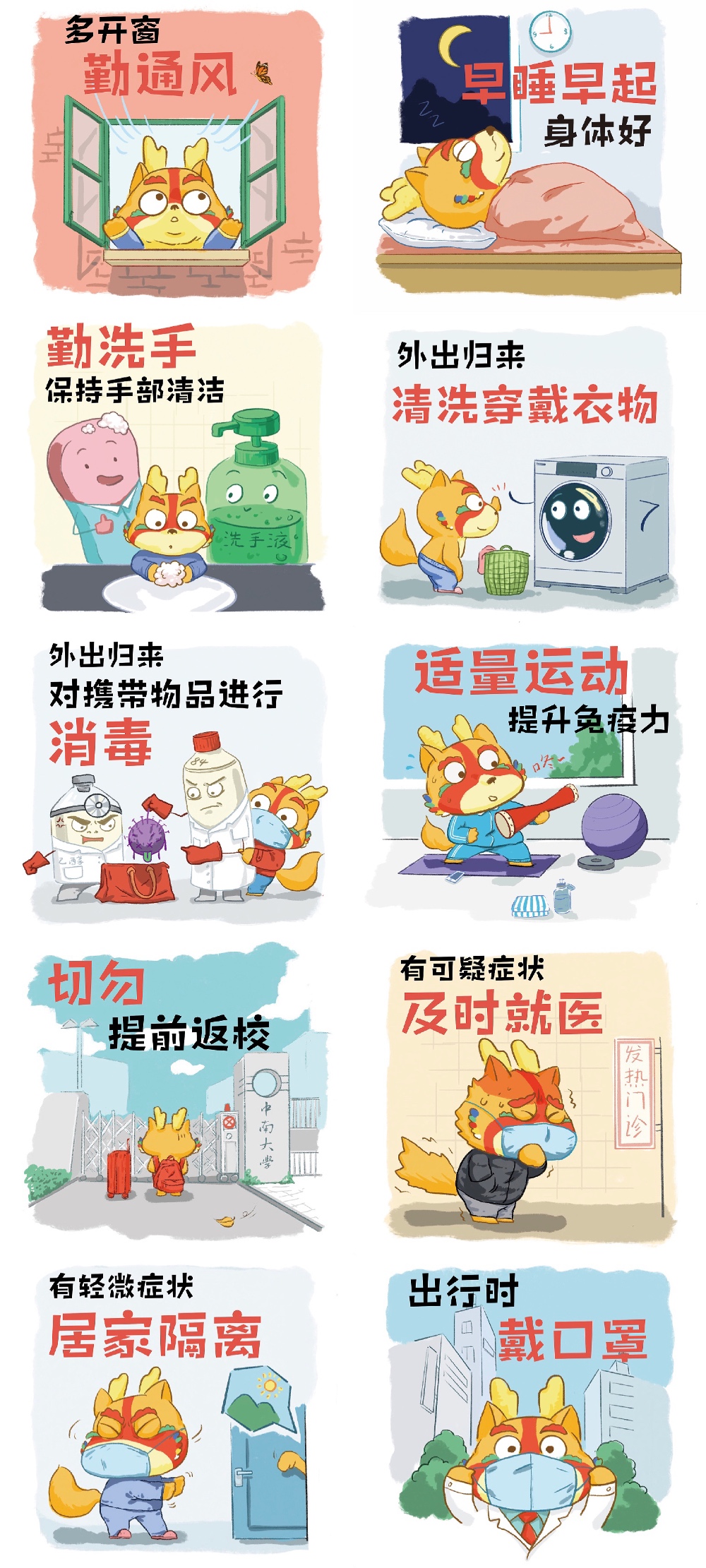 作品说明:这套作品的主角形象来自于瑶族的始祖“龙犬”,在瑶族传说中“龙犬”是智慧、力量与勇气的化身。希望通过可爱的龙犬形象将这些品质传递给大家,保护好自己,相信我们不久就会胜利。