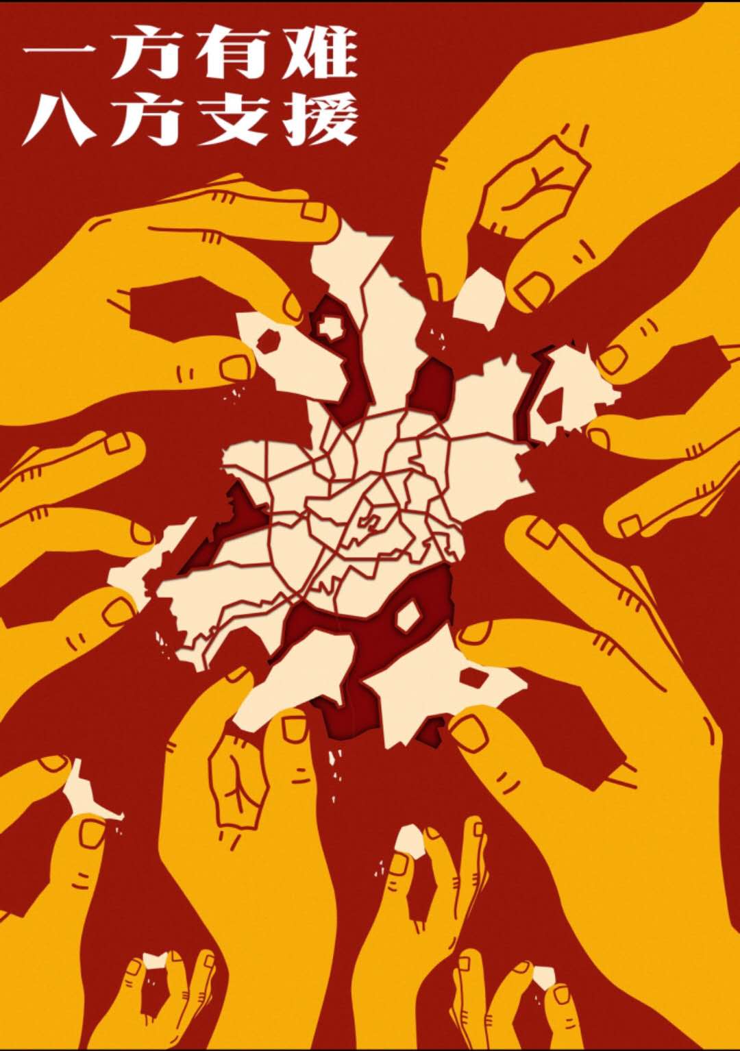 作品说明:一方有难八方支援,武汉地图和拼图相结合的方式,每一只手代表中国各个地方的人民,寓意为我们每一个人都为武汉加油!