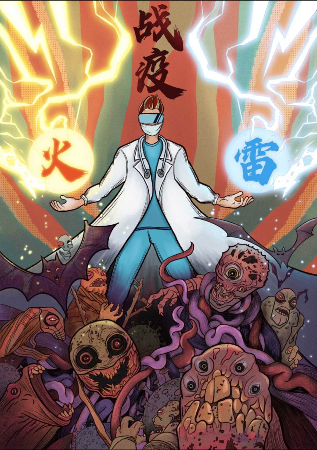 作品说明:本作品通过武汉的“火神”“雷神”两座医院的名字得到的创作灵感,主要是想体现向火神山医院和雷神山医院的建造者们致敬,同时也向共同抗战疫情的人民致敬。火雷噬嗑,众志成城,天佑中华!