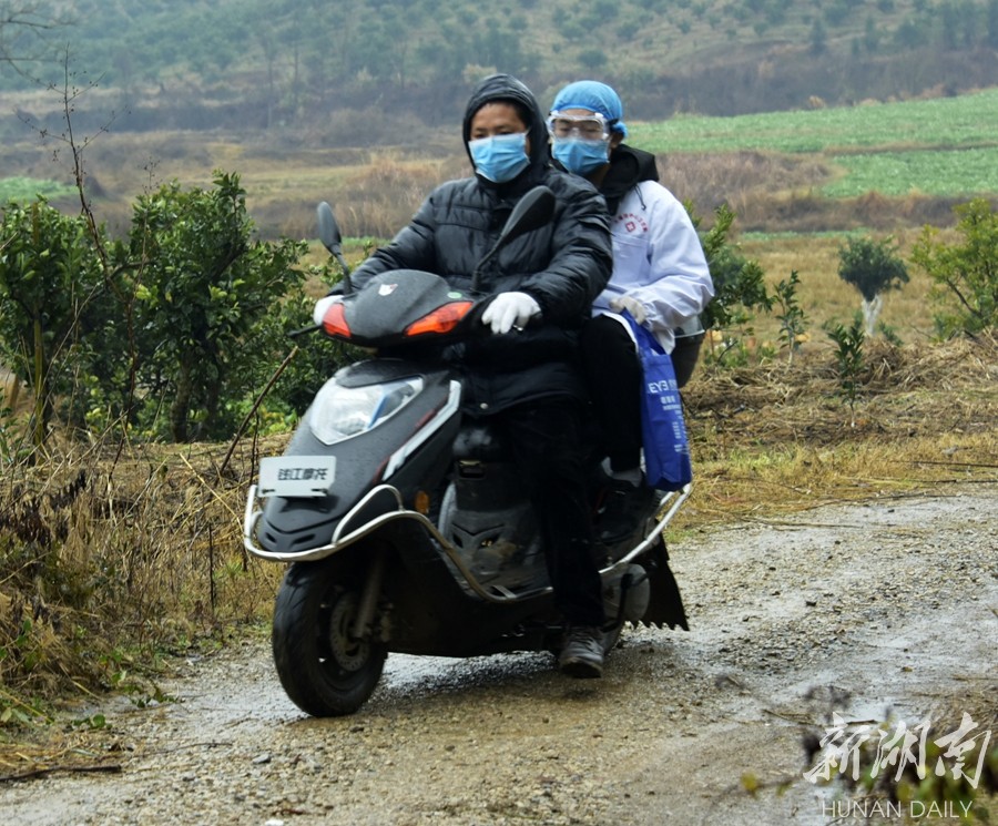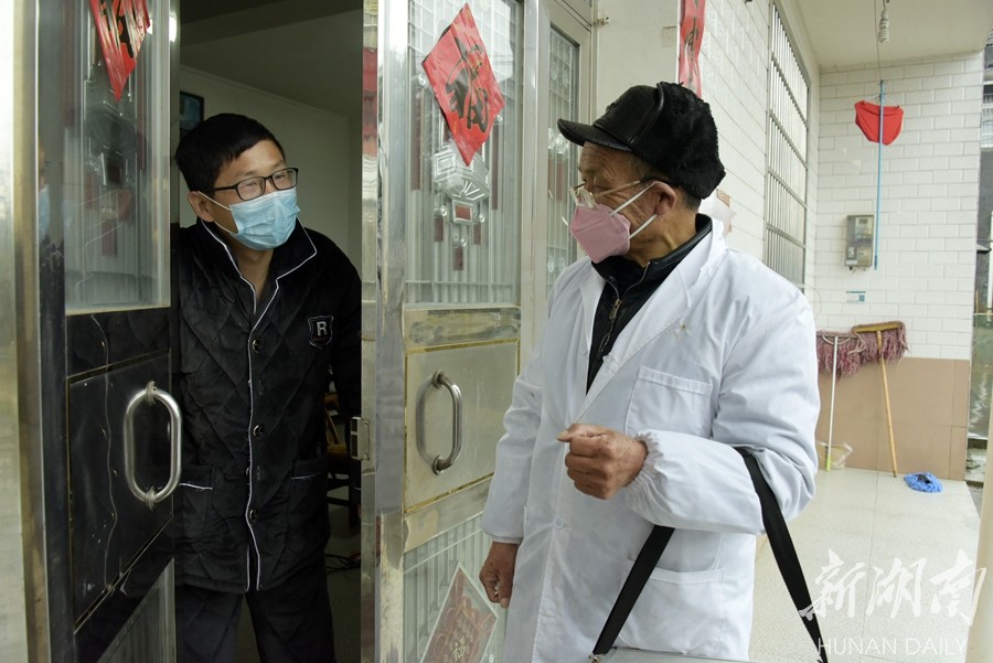 2月6日,澧县大堰垱镇亘山村,胡国轩向被隔离对象了解情况。72岁的胡国轩是澧县大堰垱镇的乡村医生,从医50余年。1月23日起,他承担起该镇摸排新型冠状病毒感染的肺炎疫情隔离对象的任务,并对摸排出来的50余名隔离对象进行每天2次体温检测。正在常德高职院医学系学习的孙子胡粤目睹爷爷的辛苦,便主动联系村镇领导,请缨作战,并与爷爷分片分工负责。因为胡粤不会骑摩托车,他的父亲胡建平便自告奋勇,每天驾驶摩托车陪同胡粤完成任务。柏依朴 刘雅辉 摄影报道