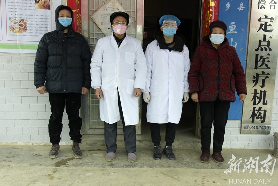2月6日,澧县大堰垱镇亘山村,胡国轩(左二)与儿子胡建平(左一)、孙子胡粤(右二)在村卫生室门前合影。