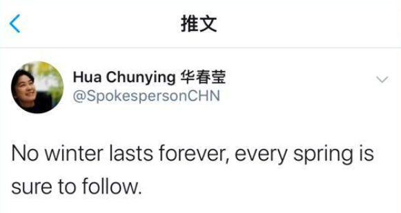 对于这句话,外交部新闻发言人华春莹在推特上发布的另一个表达也很美: