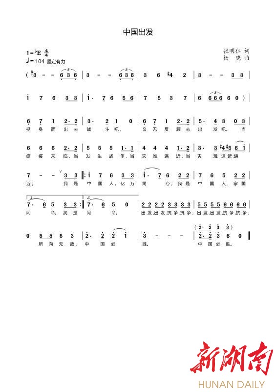 日前,由张明仁作词、杨晓作曲的抗疫歌曲《中国出发》录制完成,并将作为公益歌曲演唱。