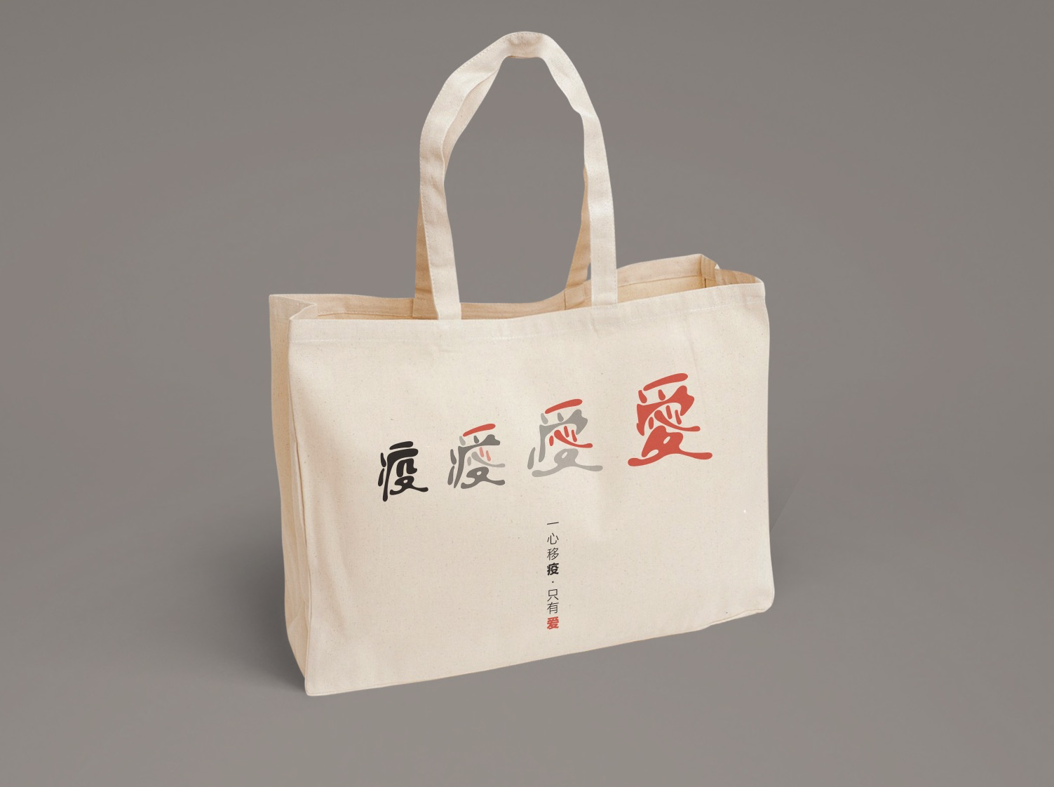 作品说明:帆布袋设计体现了大爱的精神,全国人民团结精神,简约字体变形设计,纪念这一刻,我们用爱来击退疫情!