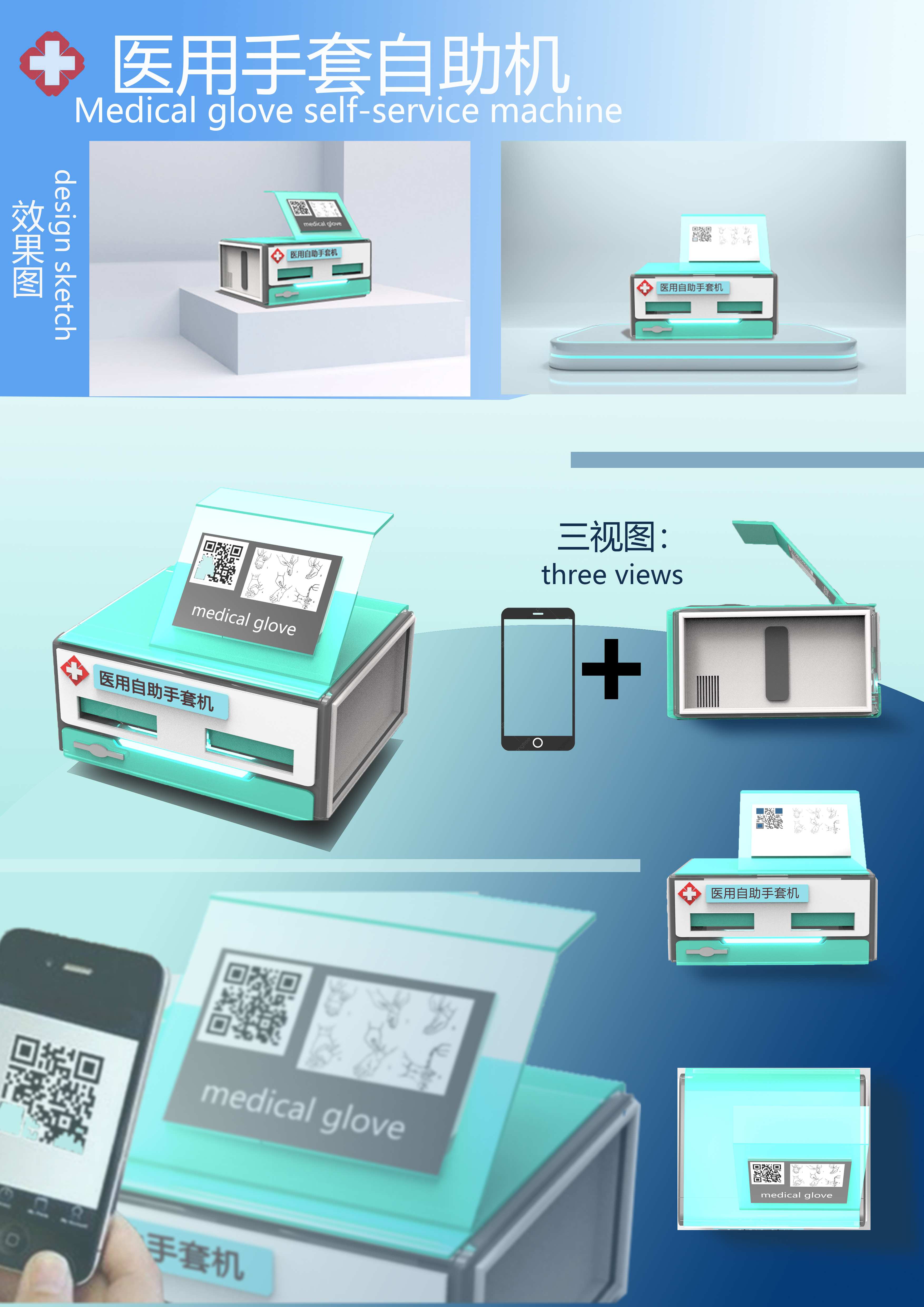 作品说明:2020年,我国发生新型冠状病毒肺炎,手套成为疫情期间外出购物以及医用人员的必需品之一。由于病毒可以通过接触的形式传染,且医院和药店分布较散,医用一次性手套也难以方便购买。因此,无人自动佩戴消毒终端的应用,对辅助疫情的控制与管理有一定意义。