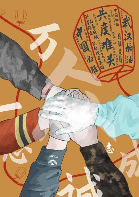 作品说明:画面选用在抗疫一线的医生,军人,警察,消防员,建筑工人的手臂,表现出万众一心,众志成城的抗疫场景。后方孔明灯上寄托着每一位人民的愿望,希望疫情早日结束。整张画面表达了在困难面前,中国人民万众一心,众志成城的精神。