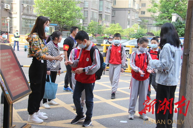 开学了,疫情防控也不能松懈。图为4月25日长沙市天心区仰天湖赤岭小学学生入校前的消毒环节。