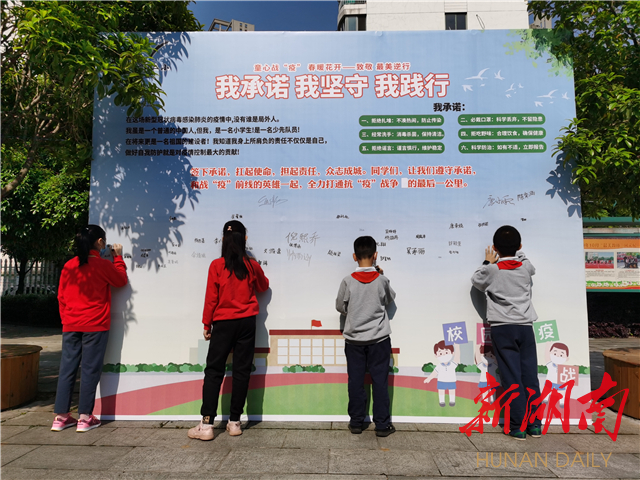 芙蓉区燕山二小的学子们在承诺墙上写下对疫情防控的承诺。