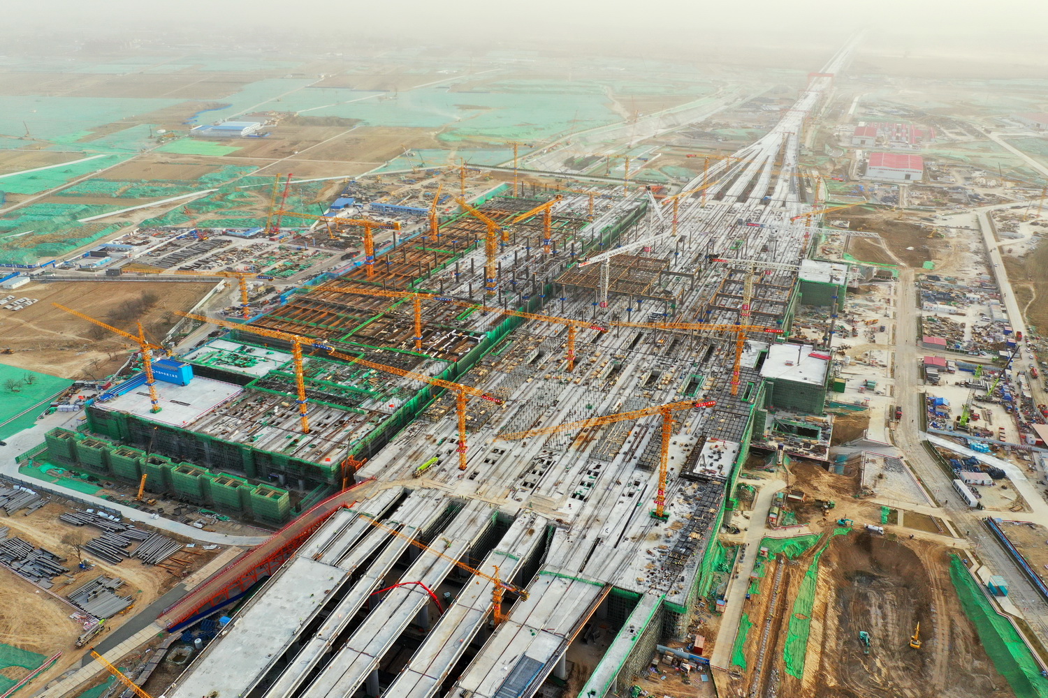 目前,雄安新区已转入大规模开工建设阶段。1770多平方公里土地上,“一方城、两轴线、五组团、十景苑、百花田、千年林、万顷波”空间意象将逐渐显现。图为京雄城际铁路雄安站施工现场。