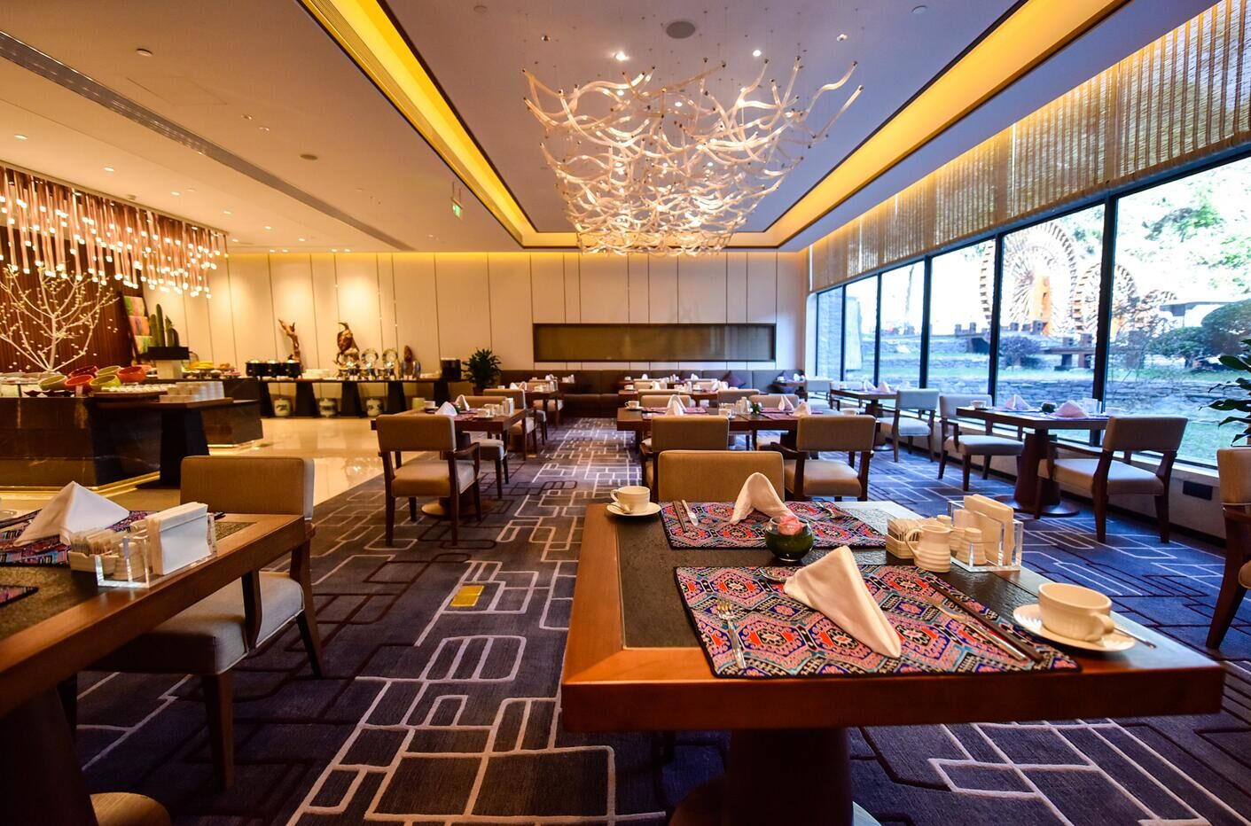 亚洲主题风格, 配以西式餐点及湖南地道美食 开放式厨房、花园景观,室外餐位并配有可以容纳10人的包房 , 可以饱览酒店及庭院风光的阁楼小包间。