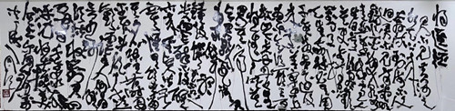 在众多客观困难的因素情况下,创作这幅巨幅大草时,根据材料与场景及创作的内容,在审美上做了调整。整幅作品用笔强化厚重感、强化节奏感、强化力感、强化金石味、强化密聚感,通些这些强化来达到整幅作品的宏大气场与震撼的视觉效果!用笔肯定自信,意狂、意放、意的酣畅注入在线条的内核,大音希声!概括起来,通过用笔的痛快,布局的密厚,弱化细枝末节,强化节奏来达到这幅作品的凝神聚气,气场宏大,视觉震撼的艺术效果。”