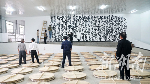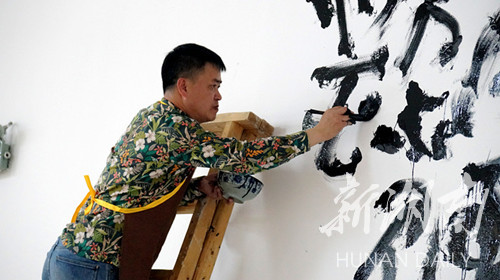 用油漆写毛笔字无法表达毛笔用笔的丰富性,也无法表达墨色的浓淡、干湿的细微变化。字小了没有视觉效果,字大了在梯子上书写的空间自由度受到限制。极近的距离写大字大草视觉局限,无法观察一个完整的字,更无法观察一行字。毛笔所含油漆有时还写不了一个大字,更谈不上一组字。油漆在墙面书写还要快,否则油漆会流满墙面,地面是斜坡又梯子不稳,书写时还要调衡……这些因素的困难远远大于在桌面宣纸上书写的难度。