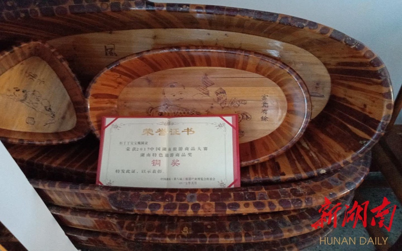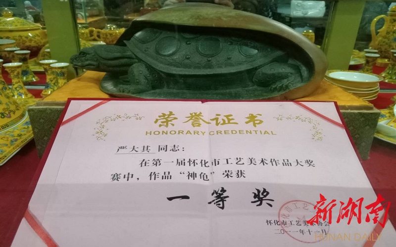 今年70多岁的严大其,热情、开放、生活乐观,精神矍铄,是一位从商企退休干部。说起他的收藏史,还得从20多年前一只木盆说起。那是1996年一场特大洪灾,原泸溪老城遭受灭顶之灾,洪水冲走了他家财产、物品,不舍的是早年在凤凰工作时带回的杉树枝木脚盆的工艺品也被冲没了。这让他非常的失落,这可是他酷爱的“宝贝”,跟随他几十年了。上哪儿找回那件喜爱的旧物呢?于是,他决定花高价钱请老木匠来家仿制,要木料,上沅陵用坪深山收购杉树的正杉枝;要铜箍去陕西、跑浙江,到上海,终于打造而成,与原来一模一样并且精致多了,使那古朴绚丽的木制脚盆释放出它独特的艺术魅力,这无异是让湘西千年民族工艺重放异彩。1995年以来,他收藏的民族工艺品,先后参加了省农博会、上海全国农林产品博览会,使湘西民族工艺这张文化历史名片叫响全国,上海外贸还将小盆带去比利时,参加2000年中国一带一路国际欧洲博览会,亮彩世界,引起轰动。这期间,湖南电视台新闻频道、乡村发现节目作了采访报道,中央二台经济频道作了采访。2017年中国湖南旅游商品大赛,小盆荣获铜奖。