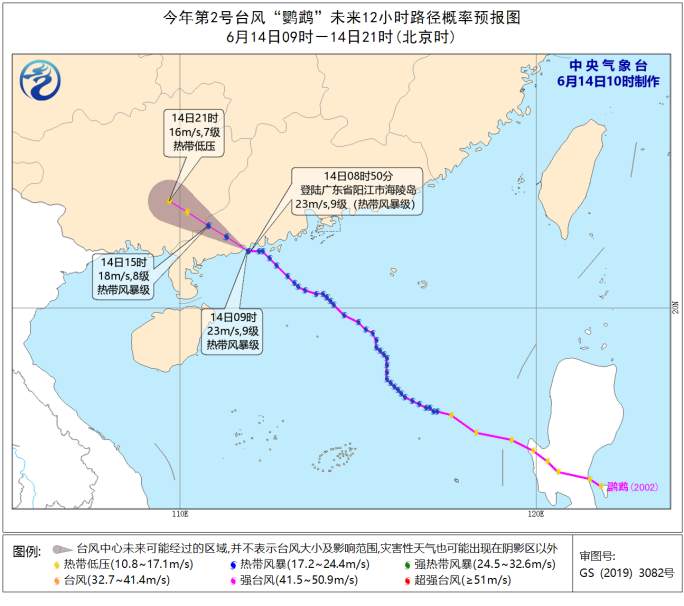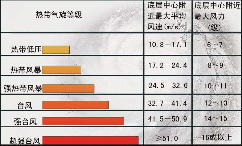根据《热带气旋等级》,我国气象局将热带气旋按照中心区域的地面最大风速划分为6个等级。