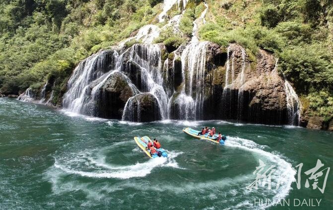雨过天晴的夏日,芙蓉镇大瀑布水声轰隆,浪花四溅。游人从大瀑布下的小路徒步穿行而过,享受着“瀑中观瀑”的清凉。