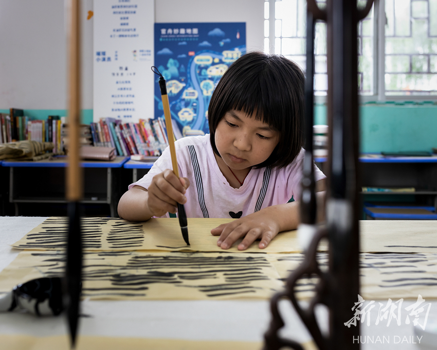 女孩叫雷伊嘉,是单亲家庭的孩子,爸爸在外面打工,她和姐姐跟着爷爷奶奶一起生活,第一次写毛笔字就特别认真,一坐就是两个小时。