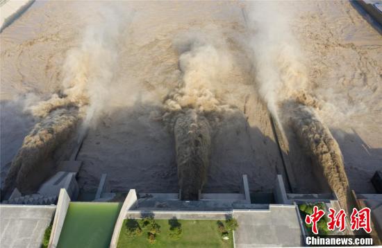携裹大量泥沙的黄河水流从小浪底水库三个排沙洞口涌出,宛如黄龙出洞。