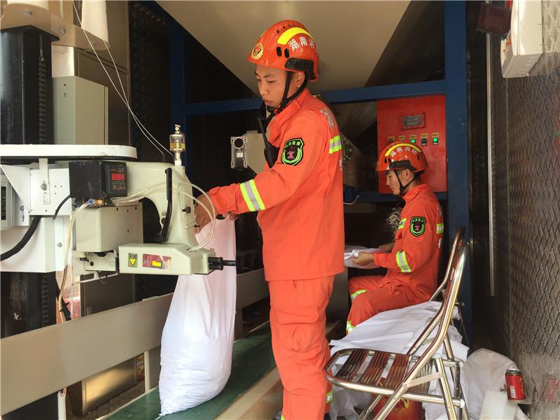 自从 7 月 14 日受领沙石装袋任务以来,湖南消防总队投入 37 名指战员轮流作业,每两个小时轮换一班,争分夺秒为筑堤提供足够的沙袋,目前已经装袋 4000 包。该模块车机动性强,能随时根据防汛作战任务要求机动转移装载阵地。