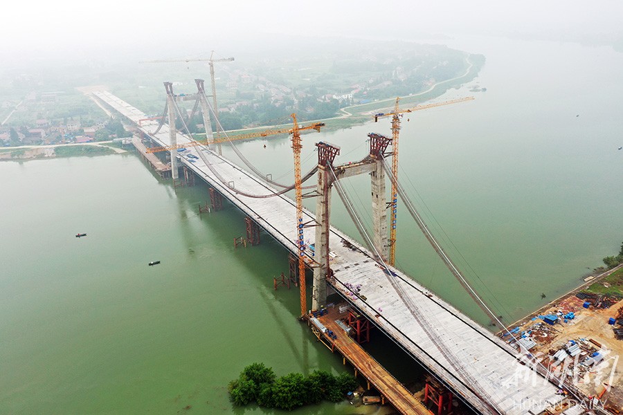 7月15日,益阳市青龙洲大桥建设工地,大桥悬索主缆已完成架设并调整到位,接下来将进行索夹、吊杆安装。该桥全长1636米,桥宽36.5米,双向6车道,设计时速80千米/小时,预计年底竣工通车。 湖南日报记者 田超 通讯员 张家保 摄影报道