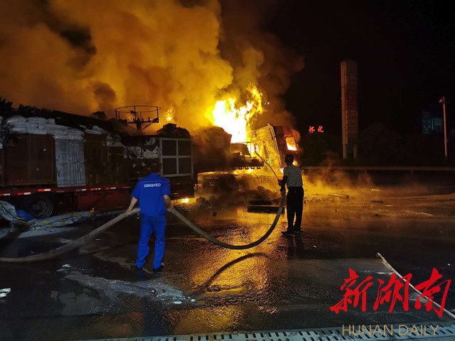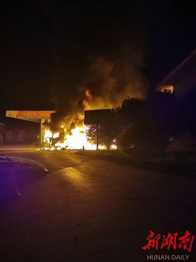 7月28日20点45分许,一辆满载货物的运输车停靠在中石化怀化吉怀高速服务区加油站旁,突然冒出浓烟燃起大火。