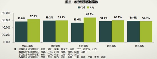 分区域来看,7月经销商库存压力主要集中在东部地区,即安徽、江苏、山东、上海、天津、浙江等省份,其库存预警指数为67.8%,高出平均水平5.1个百分点。不仅如此,东区的环比增长幅度也是四区中最显著的,比6月高出14.2%之多。对此,流通协会分析称,东区部分库存压力陡增,很大程度上受补贴政策回收、市场透支及厂家任务过高等因素影响。