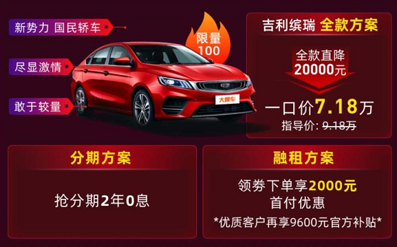 而作为大搜车与吉利汽车的直销定制车型,吉利缤瑞200T DCT 舒享型在价格上也很合适。小编看到,大搜车旗下的汽车新零售平台弹个车推出了双节同庆“品牌直供 一降到底”的活动,这款直销定制车全款直降2万元,一口价只需7.18万元。除了全款之外,还可以选择分期贷款、融资租赁等方式购车,融资租赁模式可以享受首付2000元优惠,最高还能再享9600元官方补贴,整体来看,是非常优惠的。