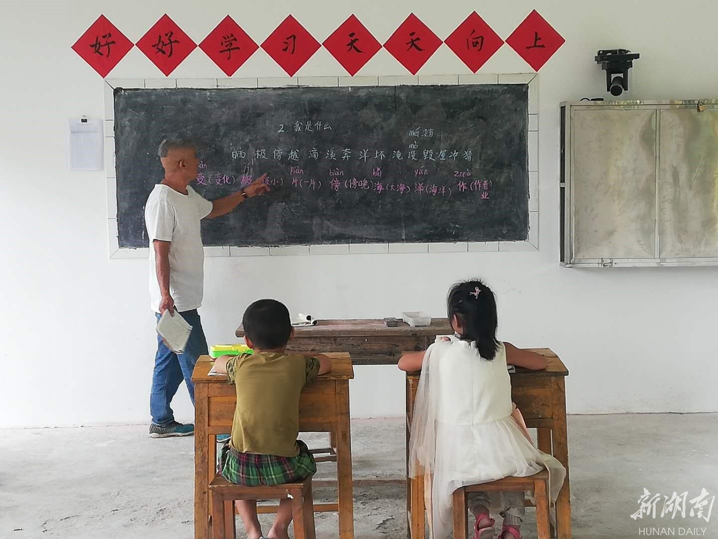 村支书胡远珏介绍,这就是他们的村校,正在上课的老师叫胡远方,也是学校唯一的一名教师。交谈中了解到,该校地处新田与宁远的交界点,属新田北部偏远学校,五六十年代周边县和村庄的适龄学生都到该校就读,当时教师有十几个,学生达470余人。时过境迁,由于种种原因,如今学校常年只有2至6名学生就读。