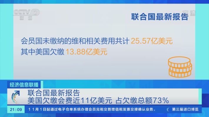 根据联合国10月公布的最新数据,截至今年9月30日,联合国会员国未缴纳的会费总额达14.97亿美元,其中美国欠缴10.9亿美元,占未缴纳会费总额的73%。会员国未缴纳的维和相关费用共计25.57亿美元,其中美国欠缴13.88亿美元。