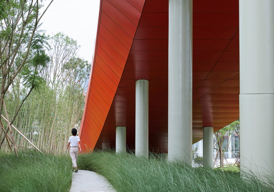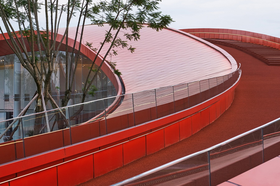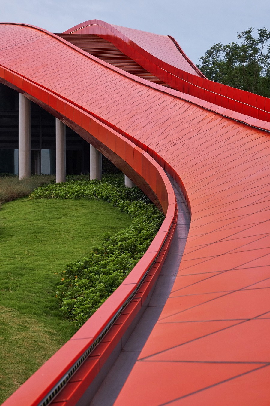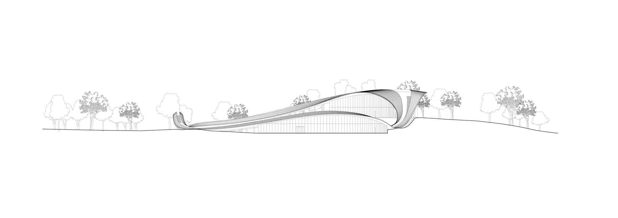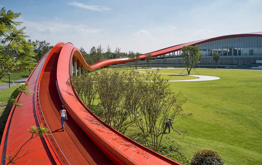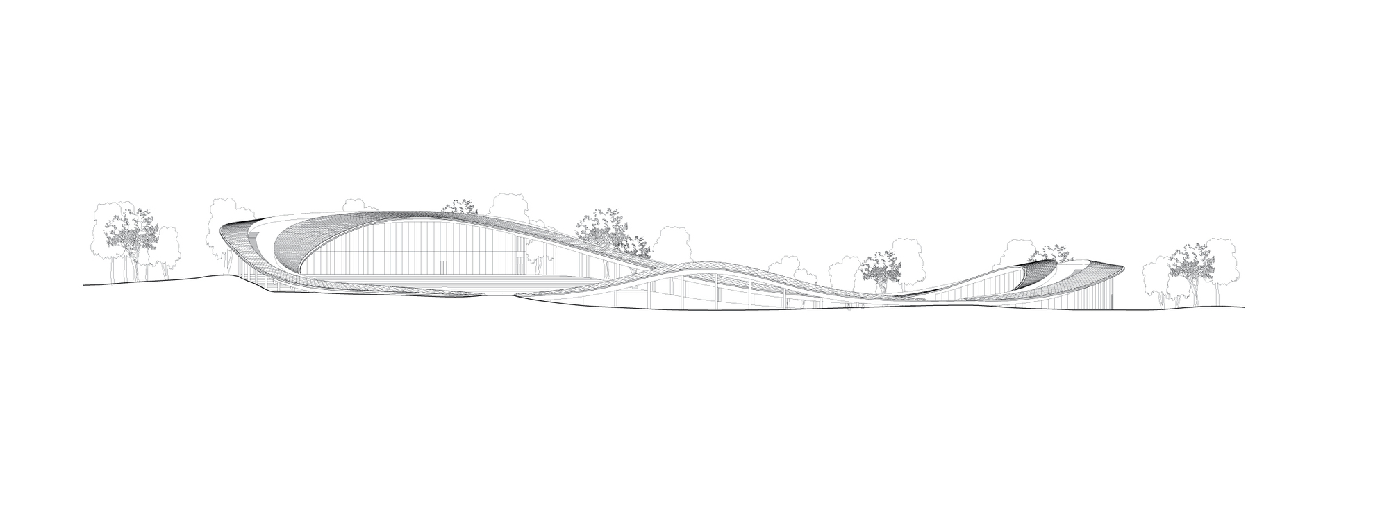 在实地考察期间,建筑师注意到周边地形的自然起伏,且基地本身就是一个非常微妙而柔和的小山。通常,在中国项目中,这些自然丘陵会被夷为平地,相反,Powerhouse Company决定以地形作为独特的设计基础,为城市环境带来有机而柔软的体验。通过塑造一个遵循地形的环形路径,可将两个独立功能的建筑体组合成一个统一的结构。随着屋顶步道的升高,形成了高低起伏的屋面并塑造出了屋顶下的建筑空间。新建筑物同时也成为了一个多层级的景观步道,自然环境在建筑结构的周围、下方和室内随处呈现在人眼前。
